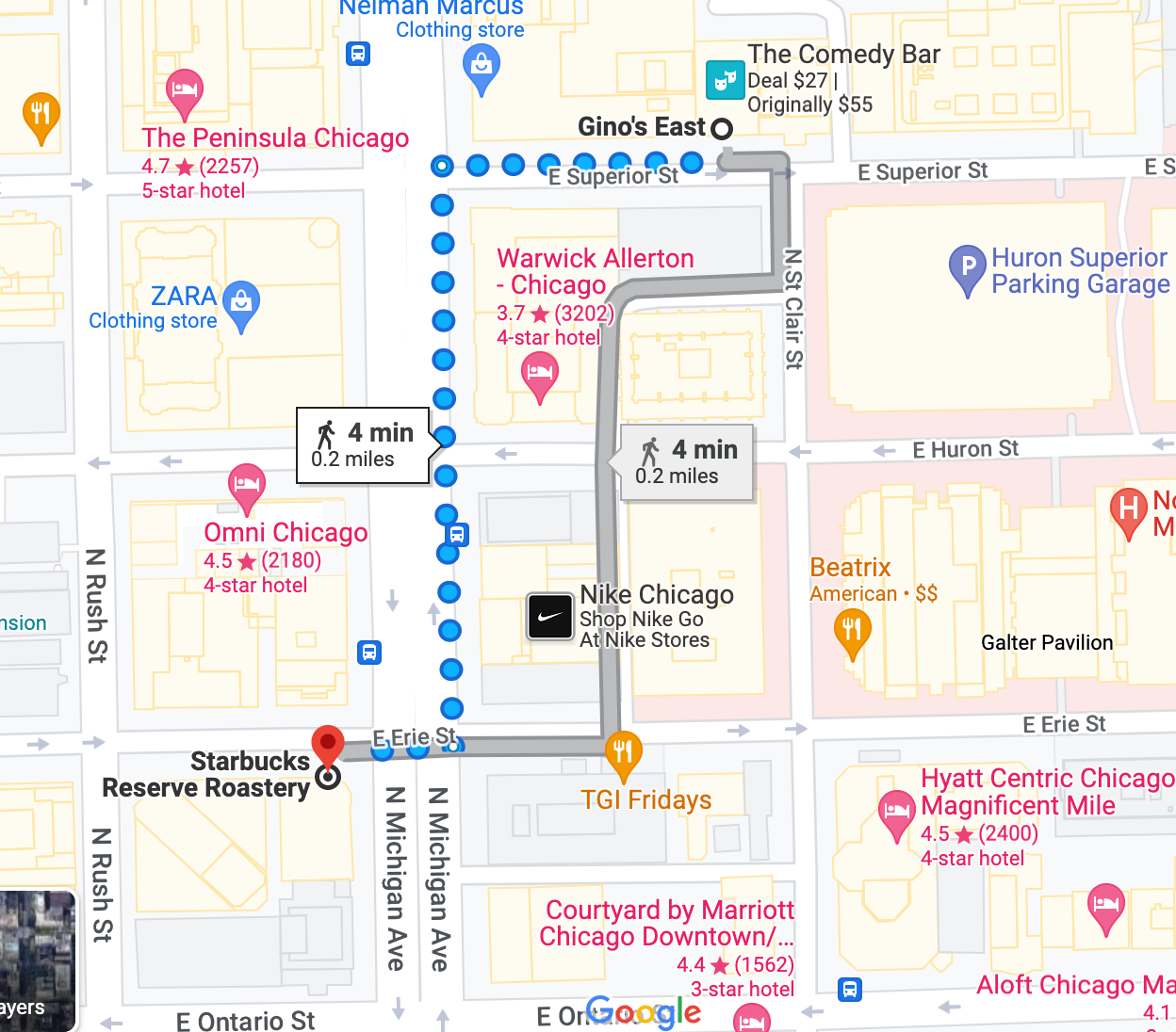 Even if you are not a Starbucks lover, you must check out this Starbucks Reserve. This Is the largest Starbucks In the world, at 4 stories high with a rooftop bar. Each level consists of something unique from pastries to coffee. Best part... They even have Ice cream! It Is super close to Ginos East, about a four minute walk.